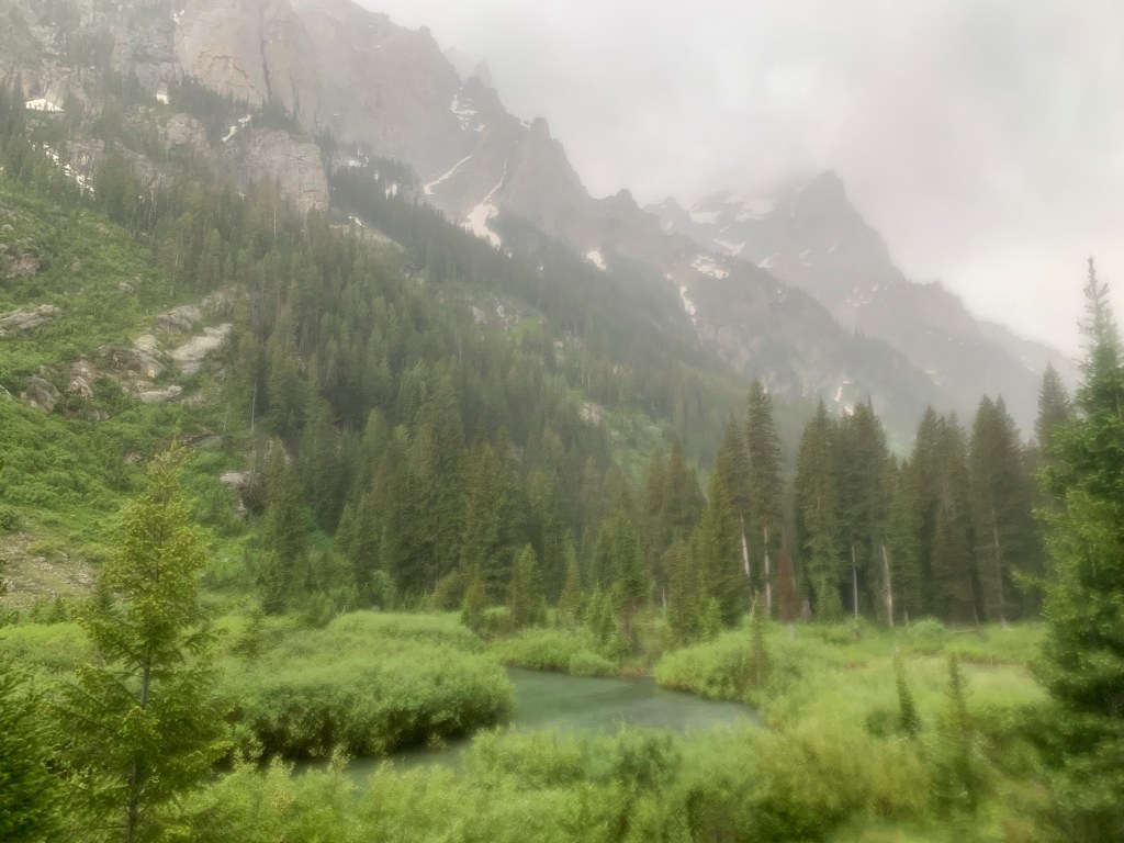 Sitting doubled over in this shelter, I contemplated turning around. Luckily I saw the bright back edge of the squall approaching the peak of Grand Teton and knew better weather was on the way!