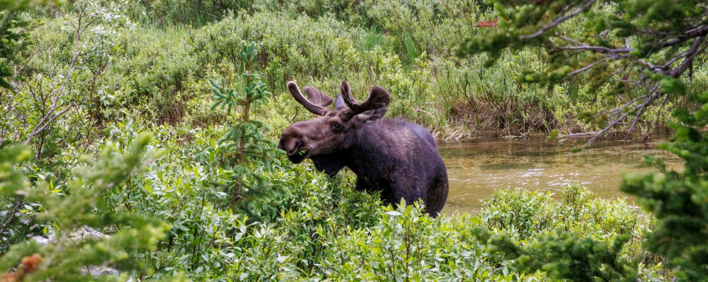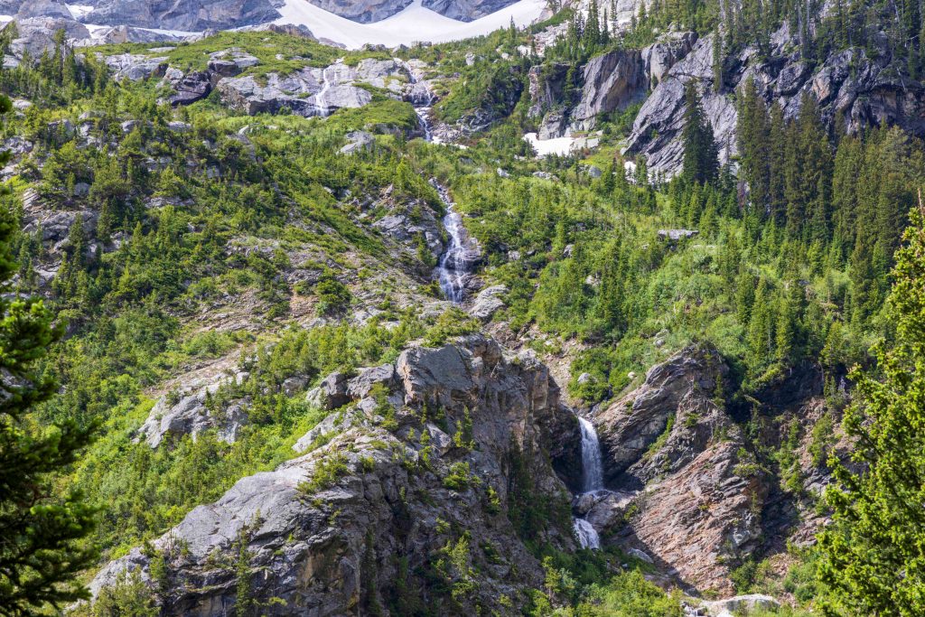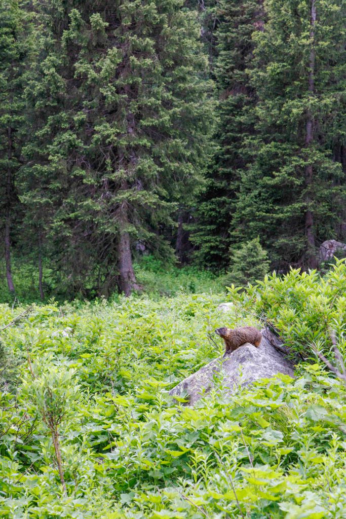 It was quite a hike. I hiked through cold rain, sleet, hail, snow, and under a beating sun, reminding me how changeable mountain weather can be! I passed silent emerald green ponds, along roaring mountain snow-melt waterfalls, sheltered under a splintered boulder, and relished the shade of ancient trees. I photographed a browsing moose, four different chittering Yellow-belied Marmots, many wildflowers, and worked hard to capture the dominance of the mountains draped in waterfalls. Sadly, no bears.