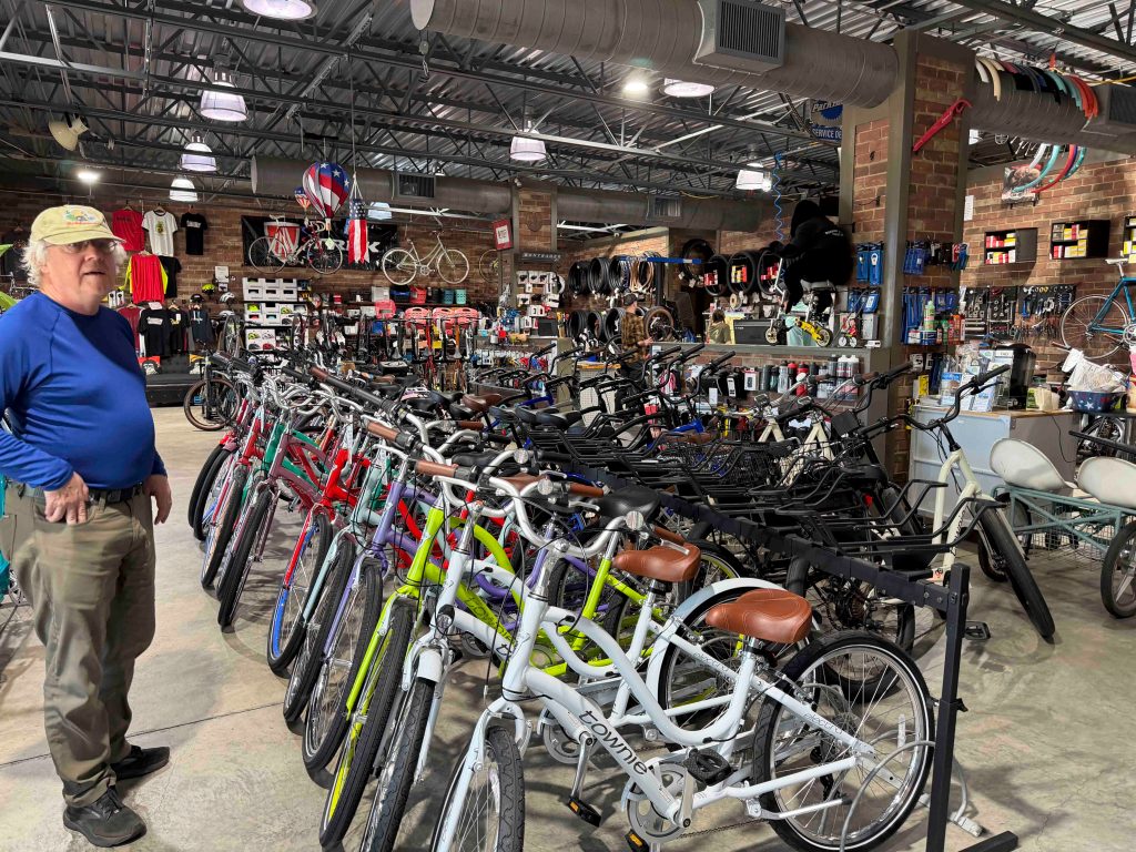 Today we dropped off Dave’s bike at a really cool shop called Monkeywrench Bicycles. Several of the bike techs muscling mountain bikes onto the repair rigs were young women. If I heard better, and they weren’t on the clock, I’d love to hear their stories. Do they race? Are they engineers and like fixing things? I found my self oggling one of the bikes, called a Townie. I tried lifting one of the bikes, and it was shockingly heavy! Meant for cruising in town (with an actual fanny-sized seat and not an emaciated tree branch), it was not of the scale — size or weight — let’s say, for fitting into precious space in the always full truck. Fun to dream though!